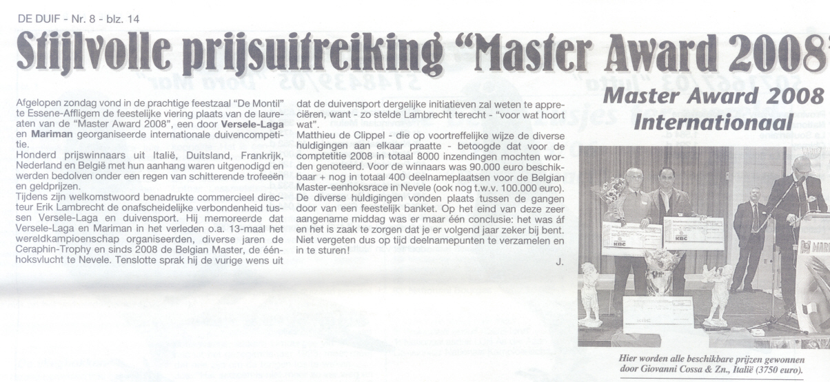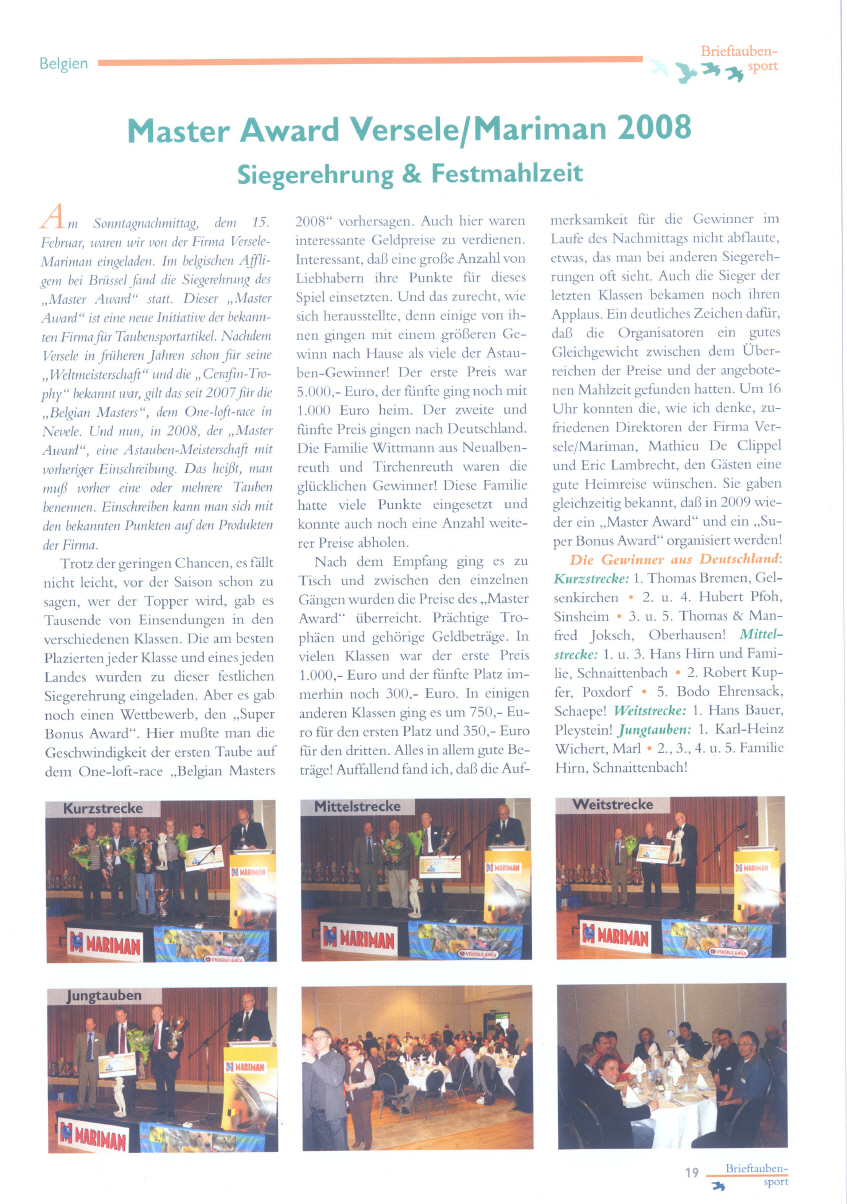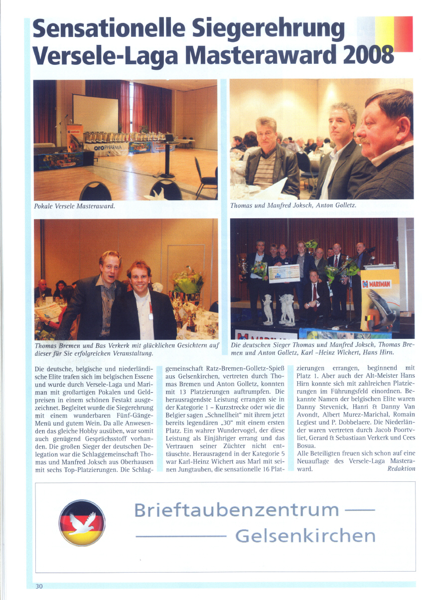 Die belgische Brieftauben-Fachzeitschrift "De Duif" berichtet über die Erfolge der SG Ratz-Bremen beim Versele-MasterAward.