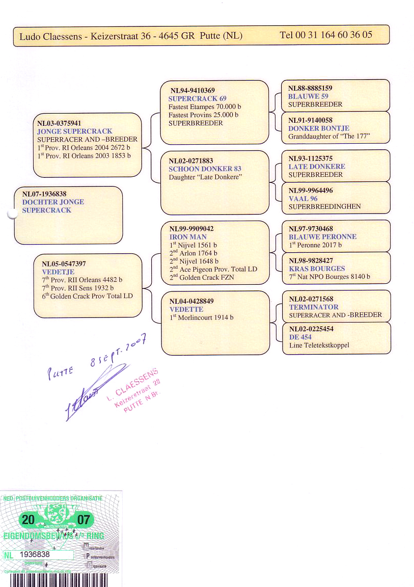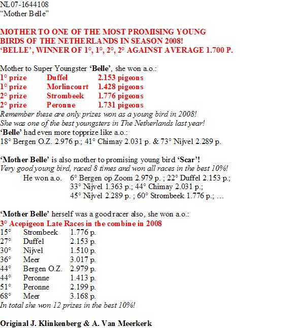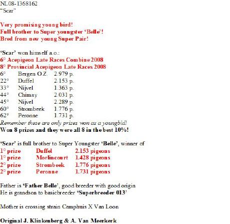 Die SG Ratz-Bremen und die SG Manfred und Thomas Joksch haben sich zu einer Zuchtgemeinschaft zusammengeschlossen. Sie kauften sich die "Mother Bell" um Sie an die besten Zuchtvögel anzupaaren und die Leistung ihrer Schläge zu steigern und das Niveau weiter zu heben. Eine Tochter der "Mother Belle", die "Belle", wurde für 7200,- € nach China verkauft und kaum eine Taube des Schlages Klinkenberg-Meerkerk ist bisher in Europa verblieben. Erweitert wurde diese durch den Sohn "Jonge SuperCrack" von Ludo Claessens dem Wonderboy aus Putte. Auch eine Rarität, es sind nur noch zwei Exemplare in ganz Europa vorhanden.