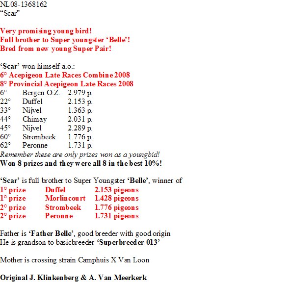 Im Dezember 2010 bekam der Zuchtschlag von Thomas Bremen und Thomas Joksch einen erneuten Zugang allererster Qualitaet: Seitdem bereichert eine exzellente Auswahl von Tauben aus dem Schlag Aelbrecht die Zuchtgemeinschaft. Marcel Aelbrecht steht fŸr eine Taubenlinie der Extraklasse und Einzigakrtigkeit in Haerte, Schnelligkeit und Ausdauer. Er dominiert mit seinen Wundertauben den belgischen Taubensport und drueckt diesen seinen eigenen Stempel auf. Hier ist es der Zuchtgemeinschaft gelungen, exzellente Geschwister und Kinder seiner Basistauben zu erhalten.